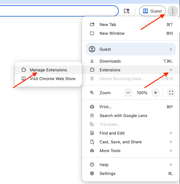 1) Access the Manage Extensions page via ⋮ > Extensions > Manage Extensions
