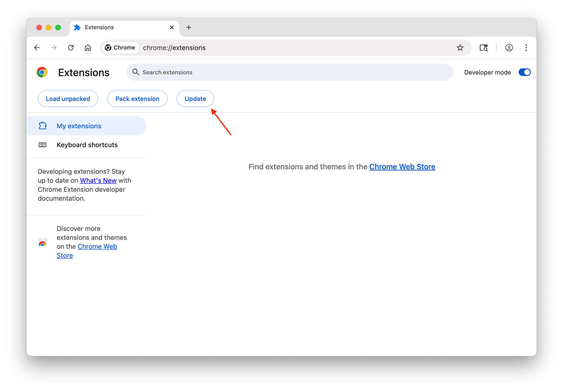 3) With Developer Mode enabled, you will see additional buttons at the top left. Click Update to update your extensions.