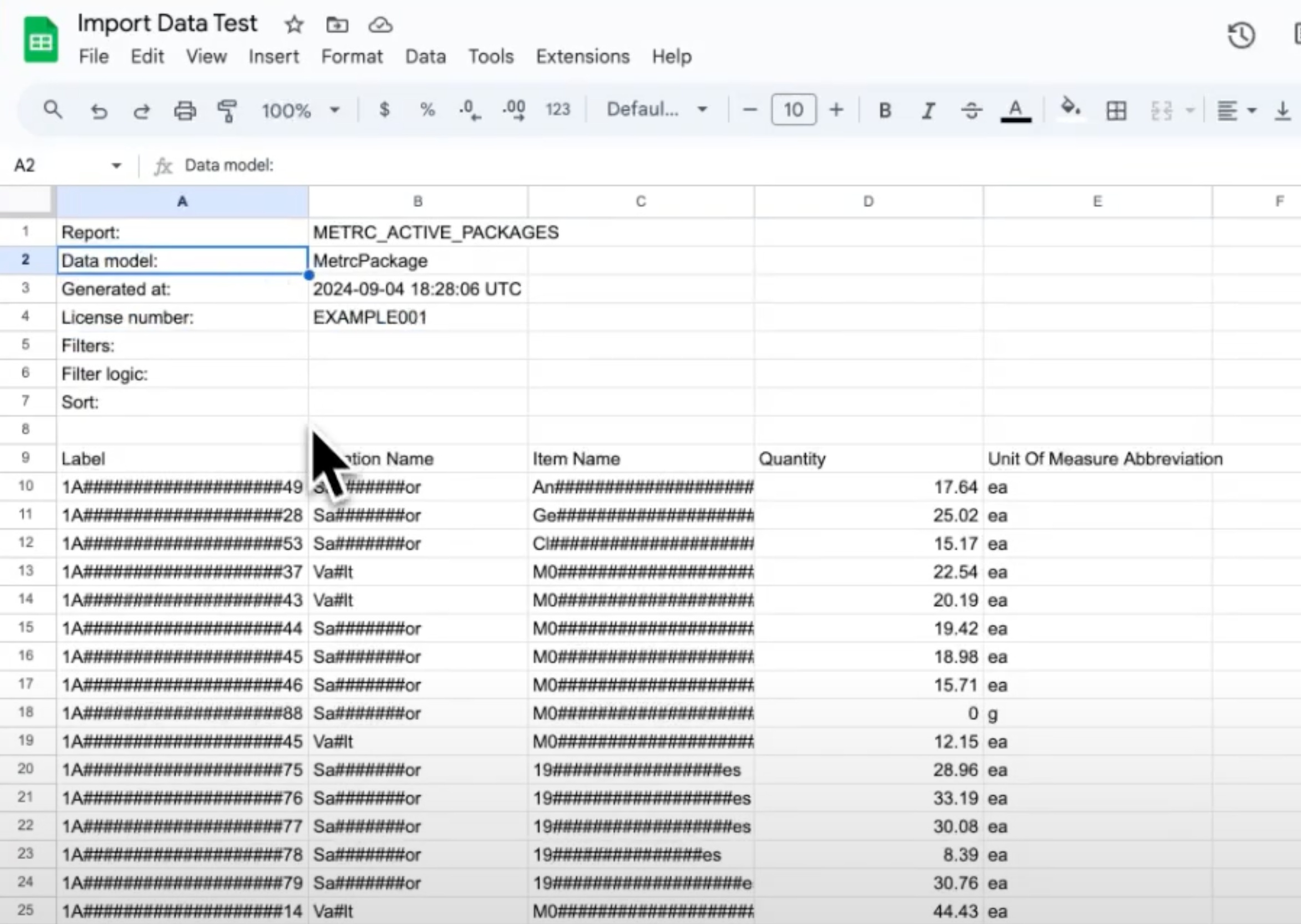 Spreadsheet Sync uses T3 API Reports to import entire Metrc datasets into a spreadsheet with a single cell formula. The spreadsheet will stay up-to-date with Metrc (updating at least once per hour).