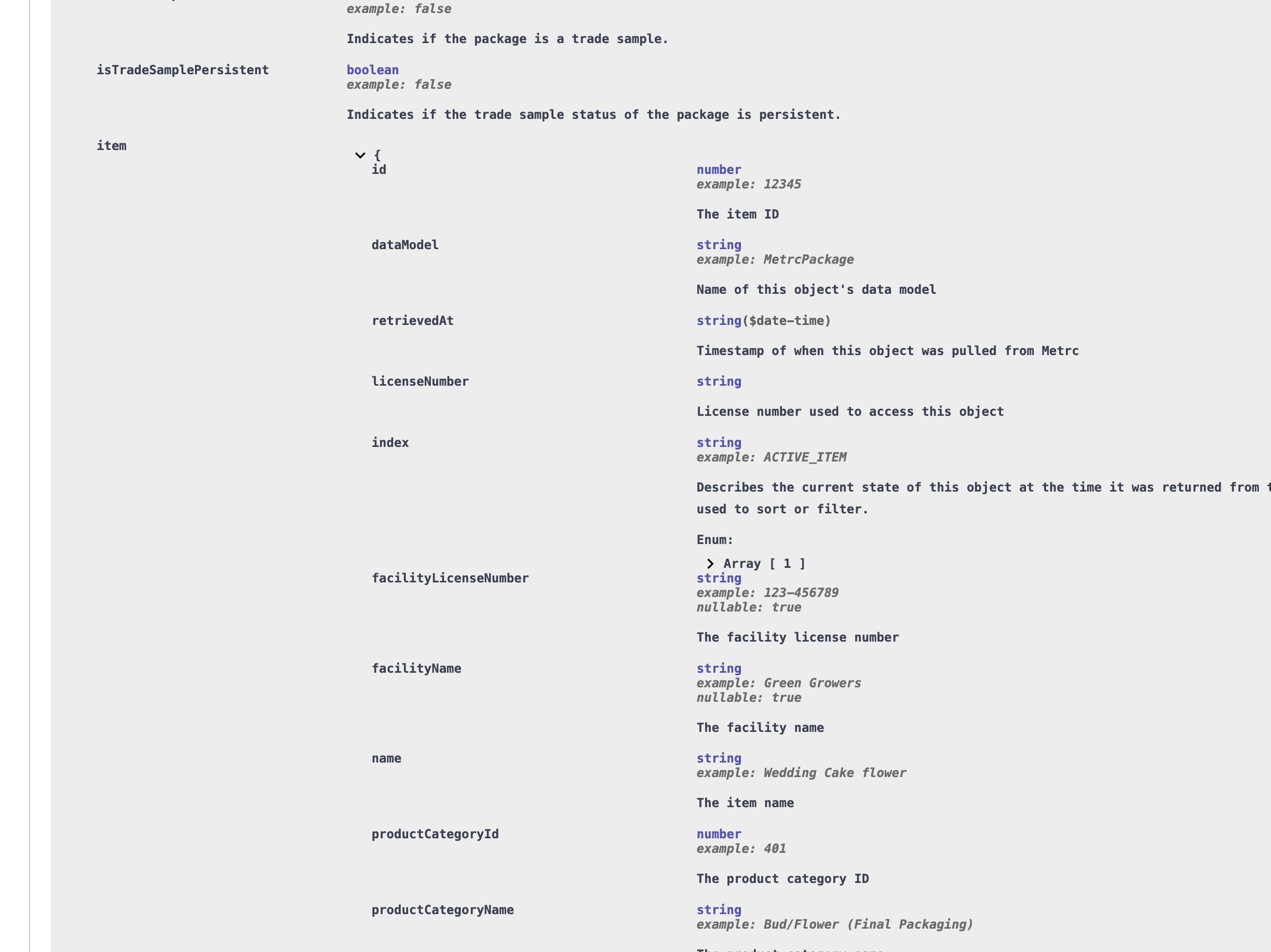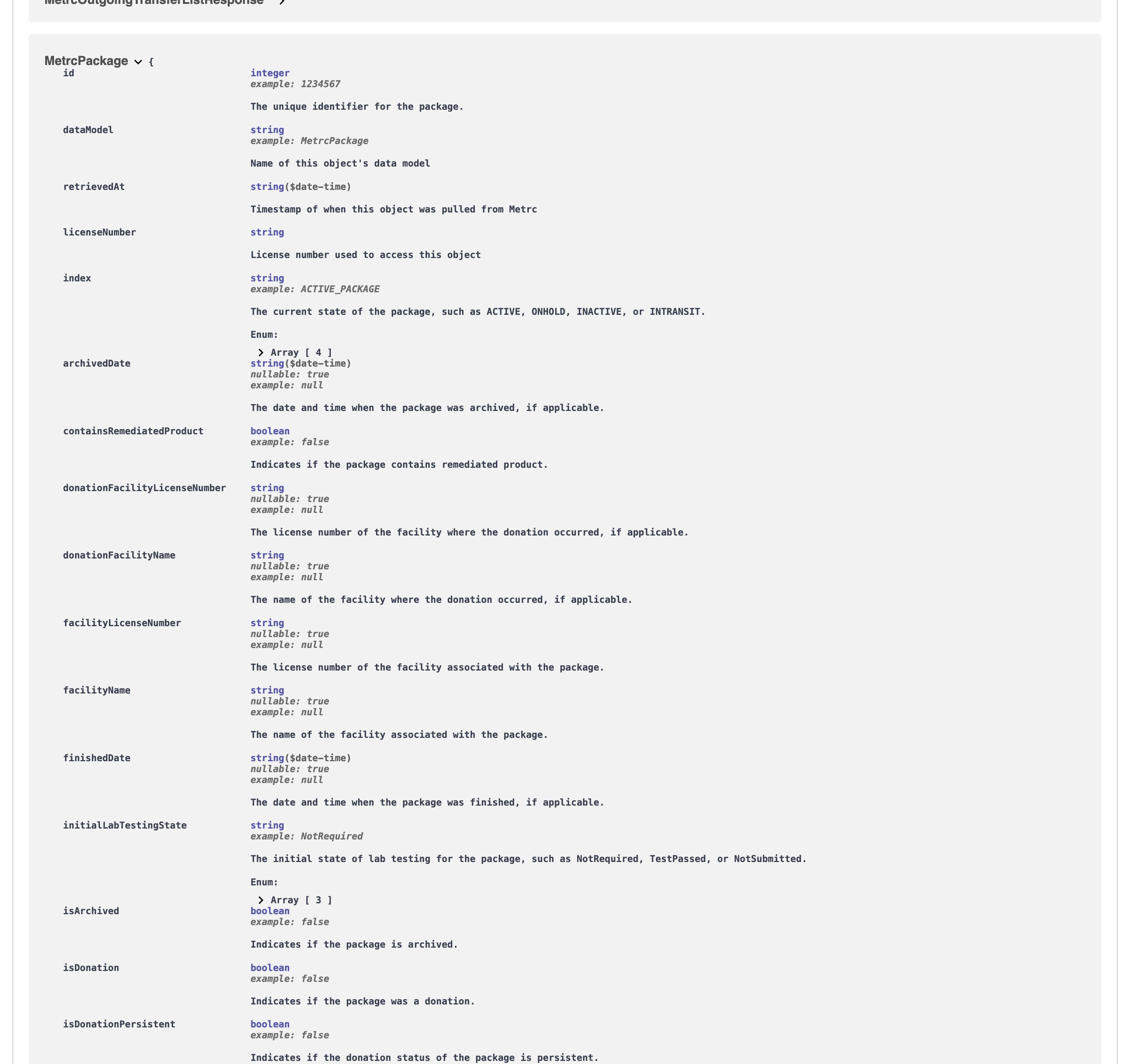 In the API response, the data model is listed as MetrcPackage. To see a list of columns for MetrcPackage, refer to the API docs: at the bottom of the page, there is a Schemas section: