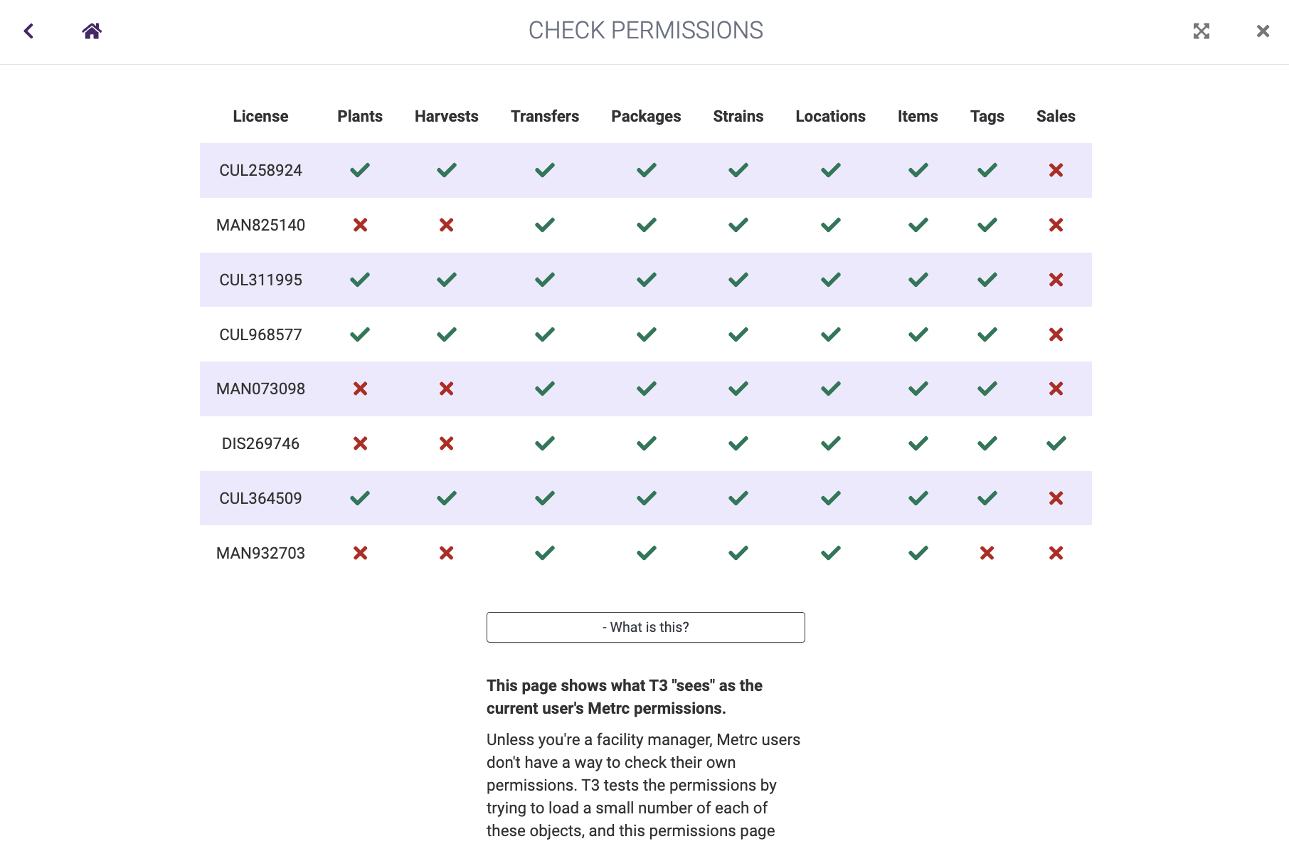 If you need to find out what Metrc permissions the current account has, visit T3 settings and click CHECK MY PERMISSIONS to access the permissions check tool.