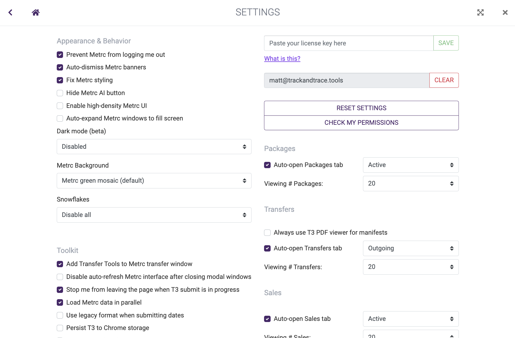 The T3 Chrome Extension is highly customizable. In the T3 Settings menu, you're able to enable and disable features, customize Metrc behavior, set table and page defaults, and enable T3 snowflakes.