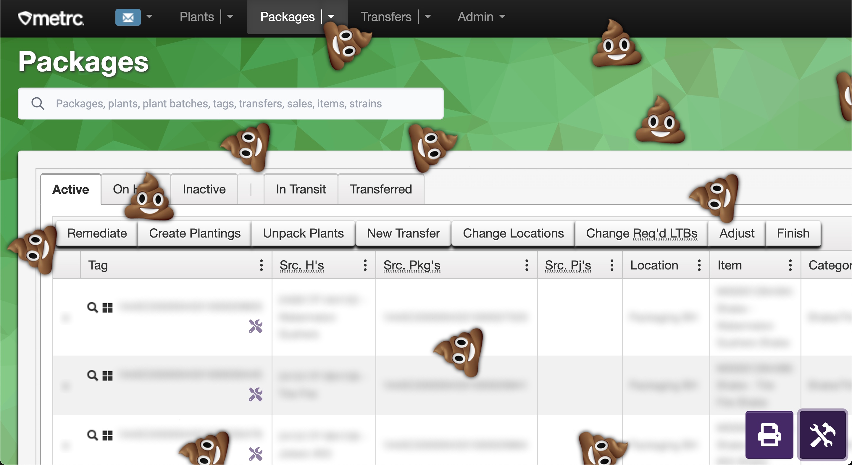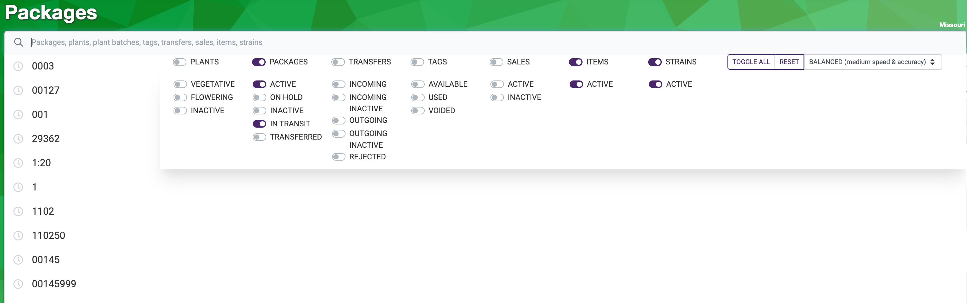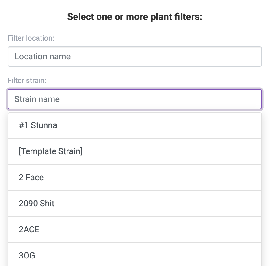 Rapidly filter plants and packages by common values like strain, location, and item.