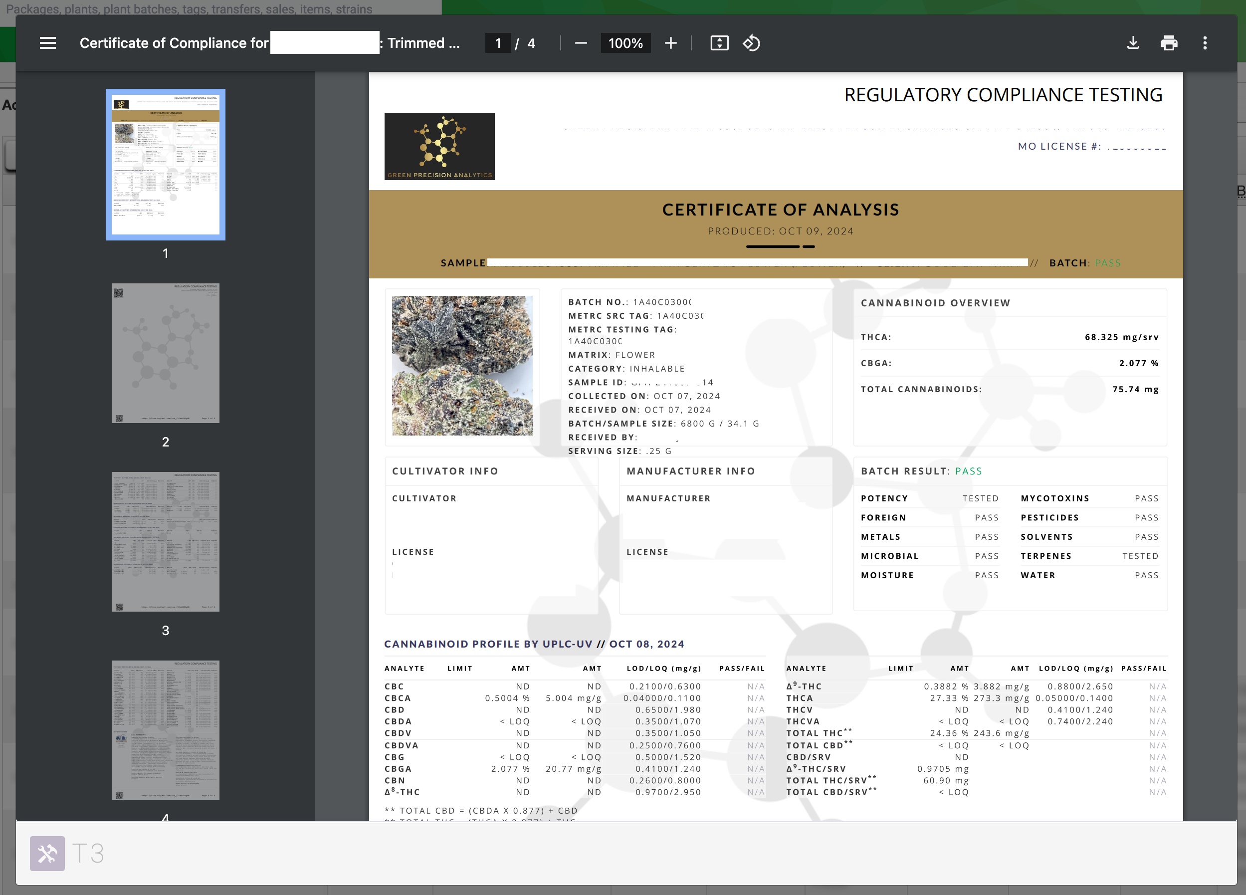 T3 allows you to quickly and easily view and print PDFs from Metrc, including manifest PDFs and lab result COA PDFs.
