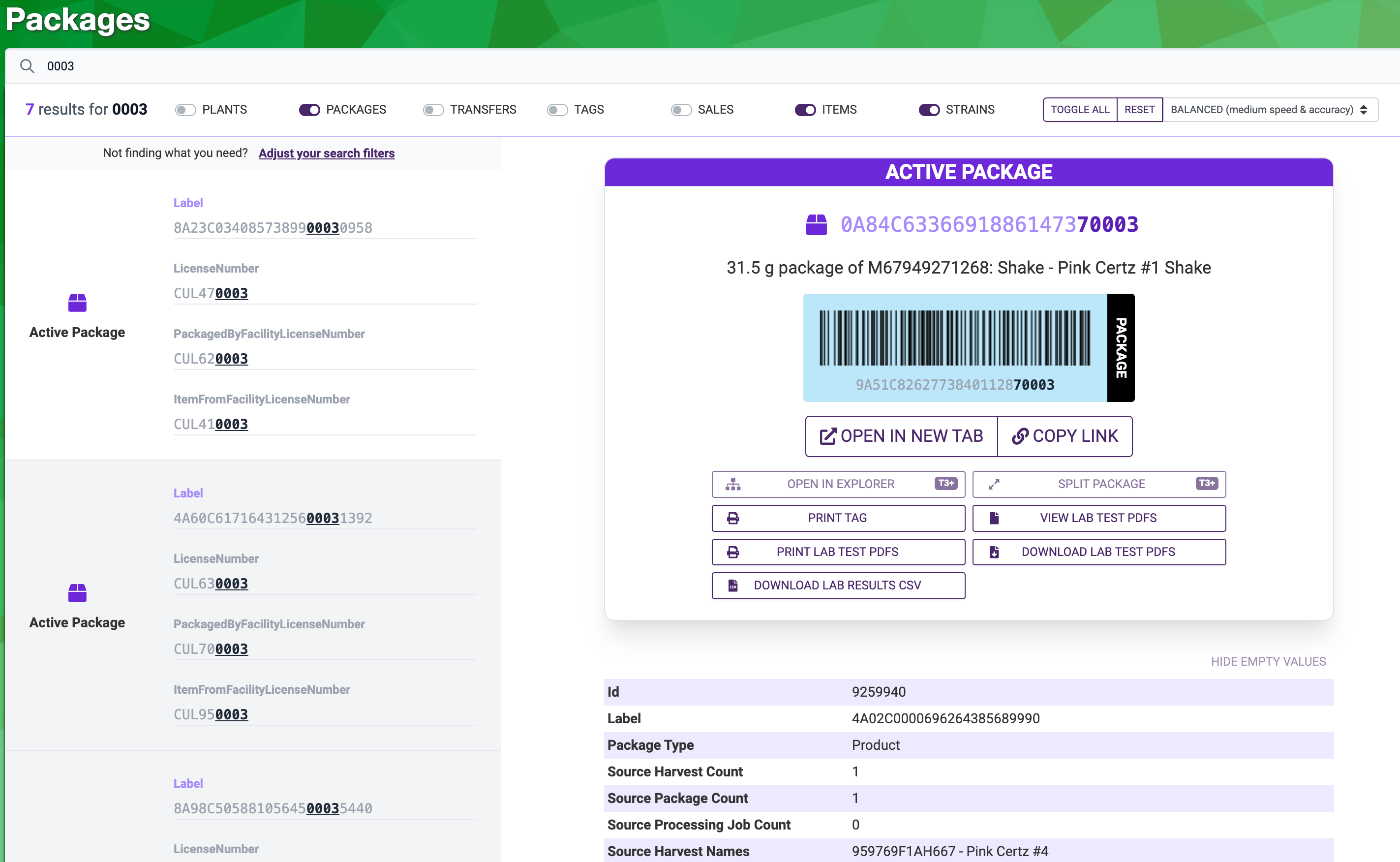 The search engine can locate anything in Metrc, and you can specify filters to drill down to find exactly what you need.