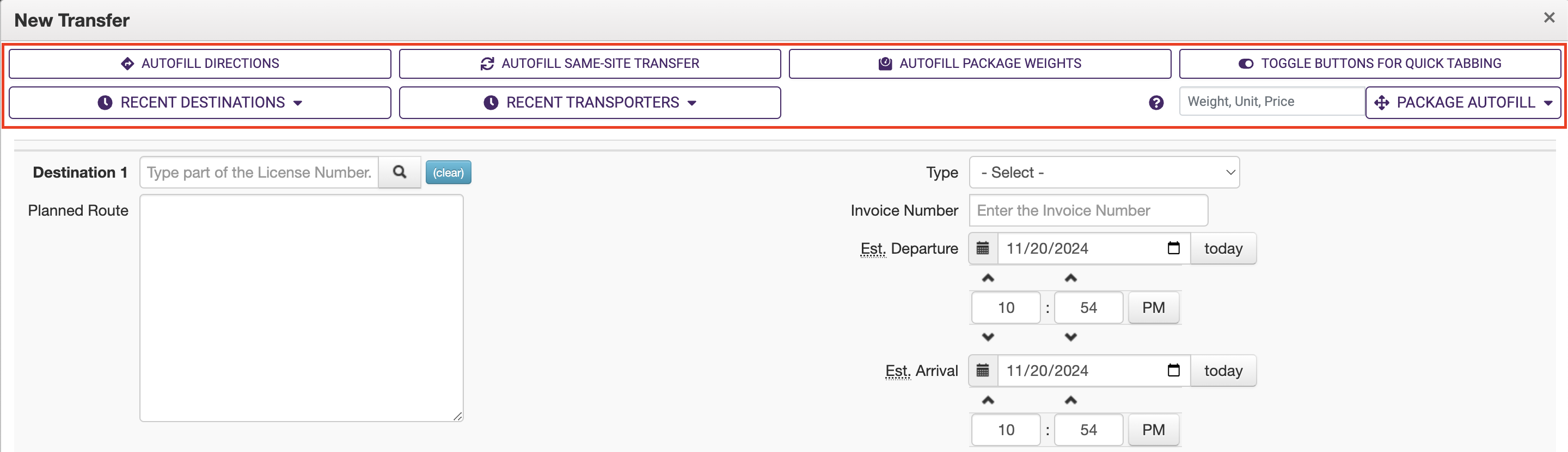 The Metrc Transfer Create/Edit form has additional tools: - Autofill directions - Autofill same-site transfer - Autofill package weights - Toggle Metrc form buttons for quicker tabbing - Autofill recent destinations (T3+) - Autofill recent transporters (T3+) - Autofill package weight/unit/price