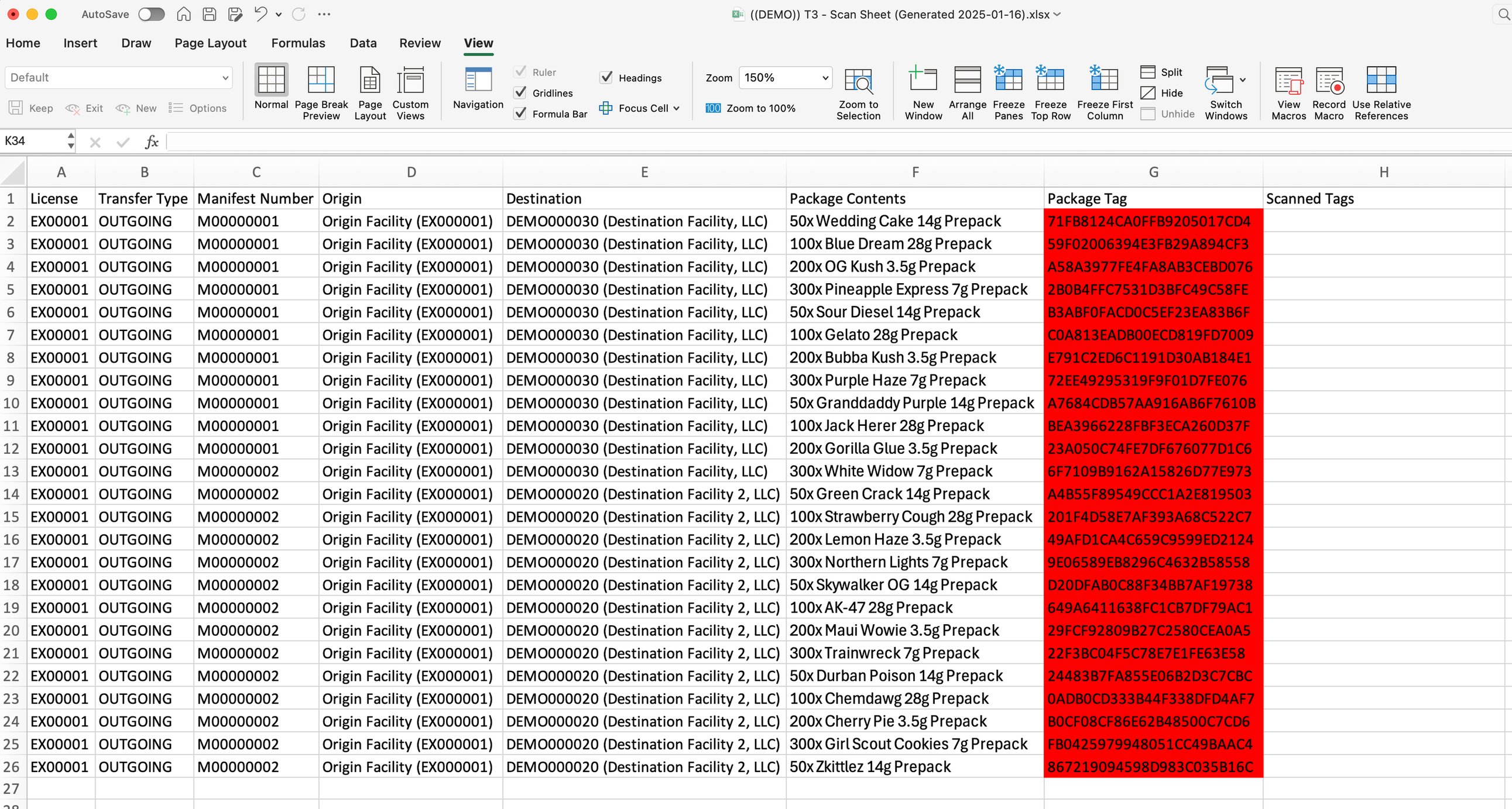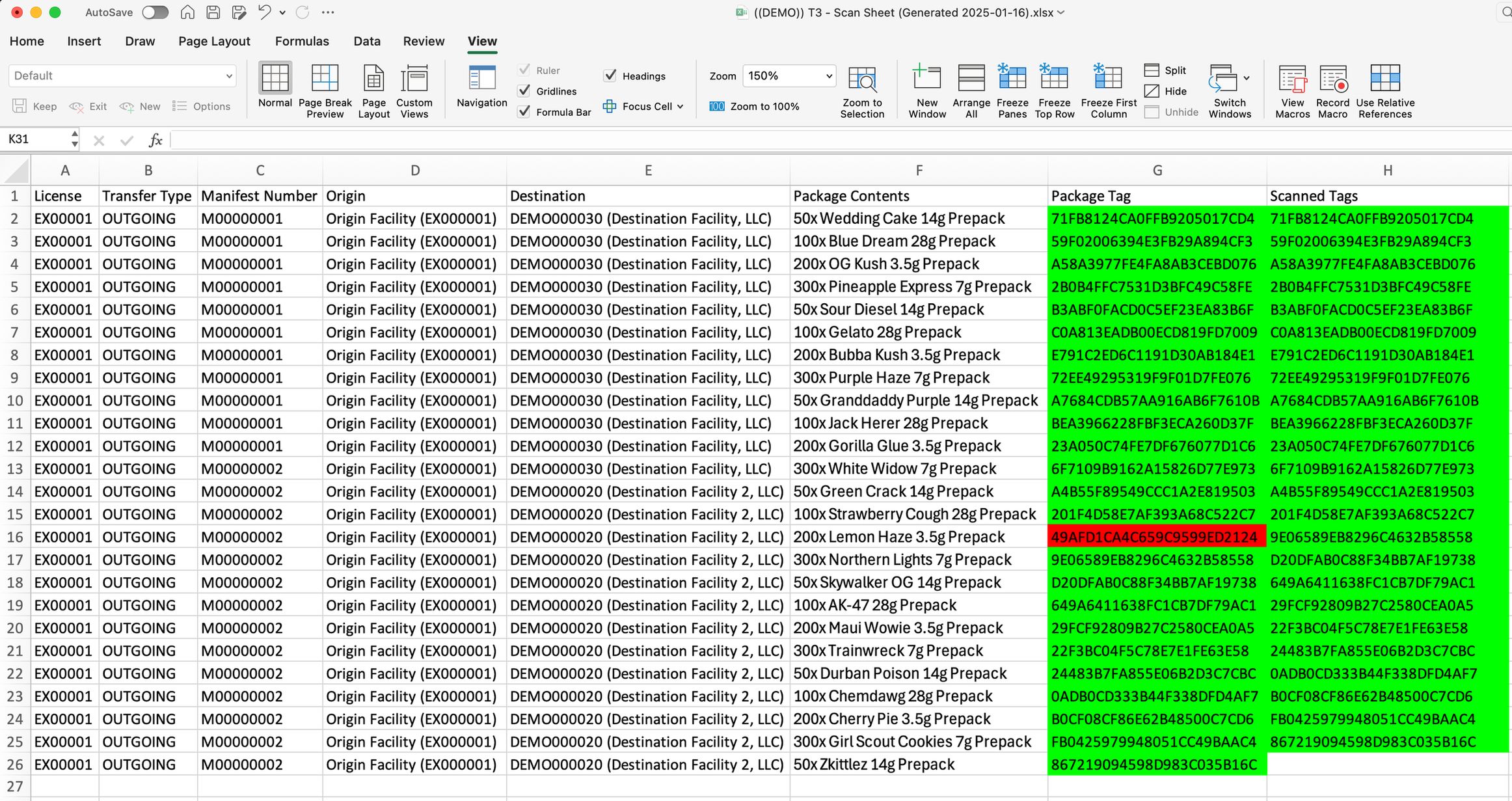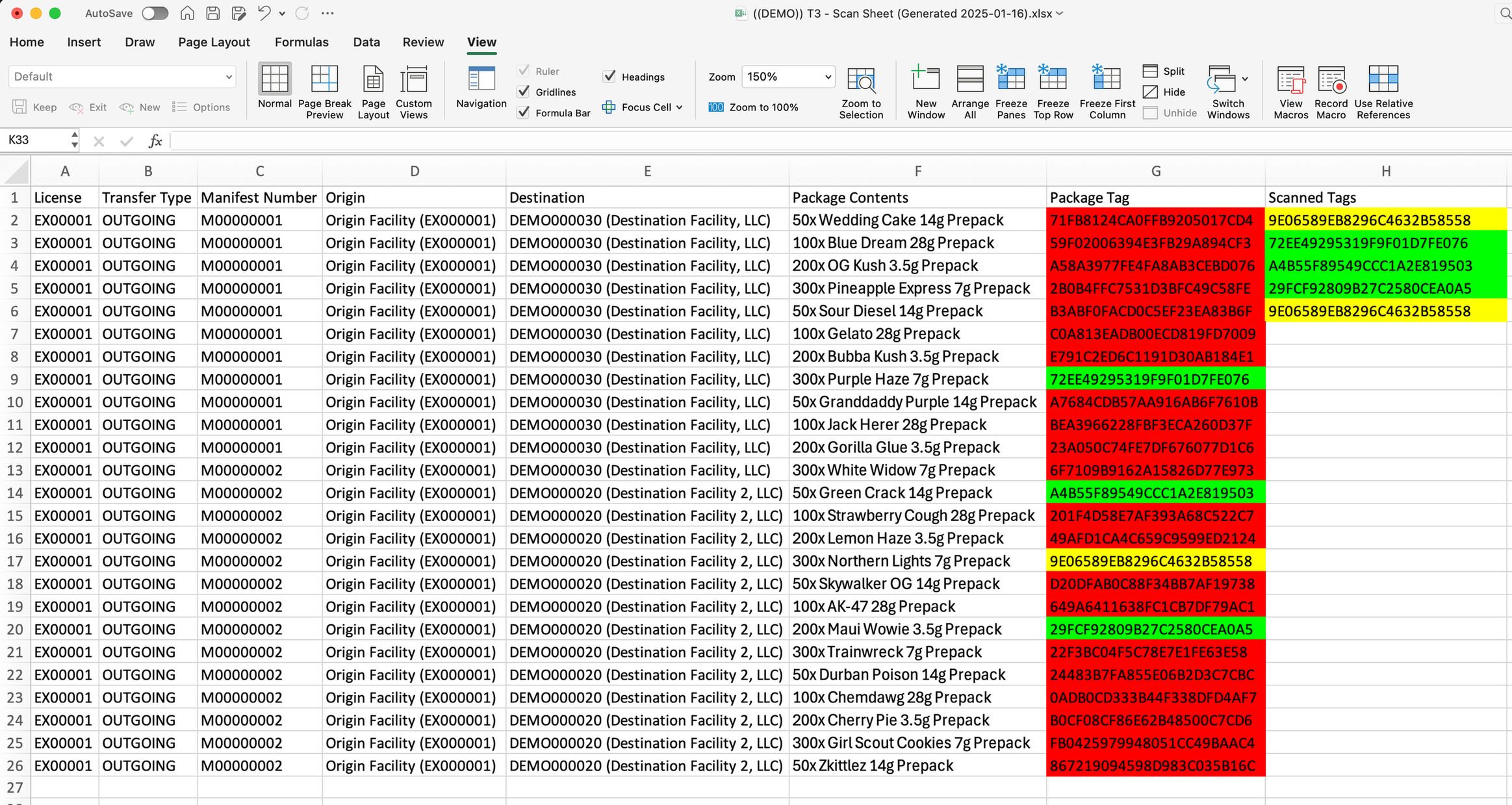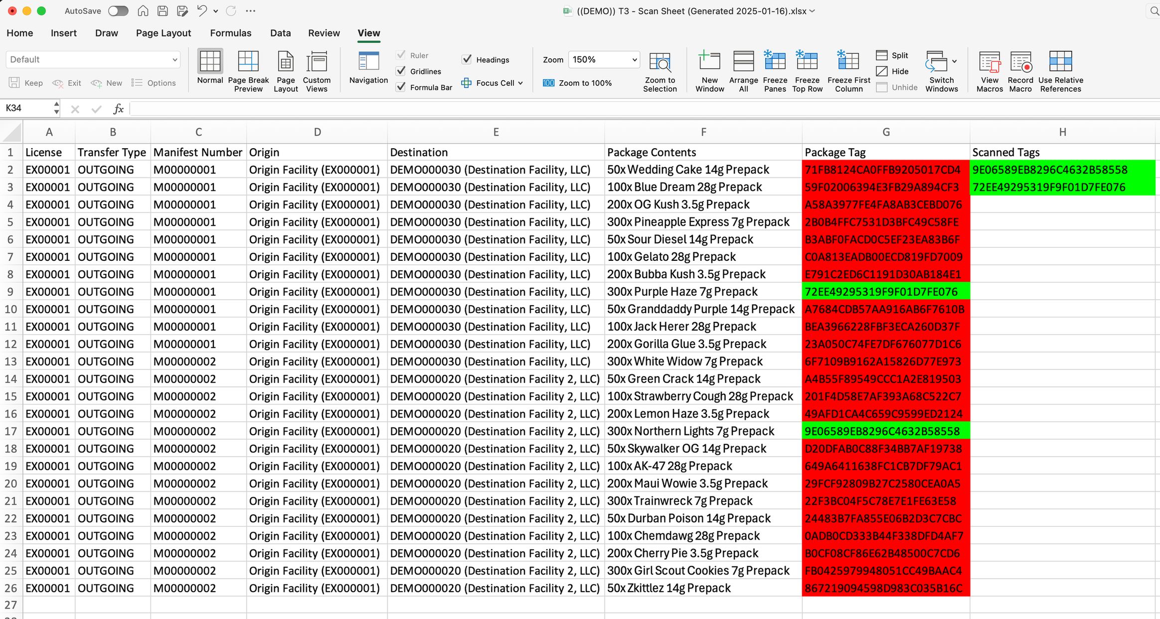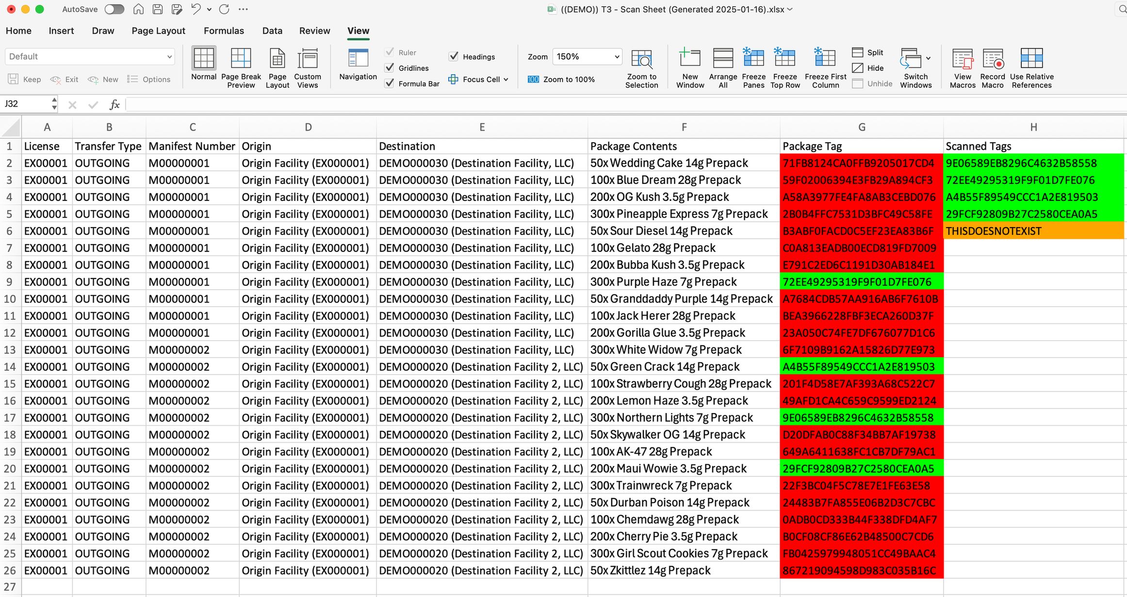 1) Open your scan sheet in any spreadsheet software. Click to select the first empty cell in the "Scanned Tags" column. 2) Scan each Metrc package tag. The cells will update with color to indicate if that tag is expected or not. Refer to the Scan Sheet color codes section below to learn what different cell colors mean. 3) Once finished scanning, review your scan sheet. - If all colored cells are green, you have successfully scanned in the entire order with no extra or missing packages. - If any colored cells are red, yellow, or orange, there is a problem. Inspect the list of scanned tags to determine which tags are missing, duplicated, or extra.