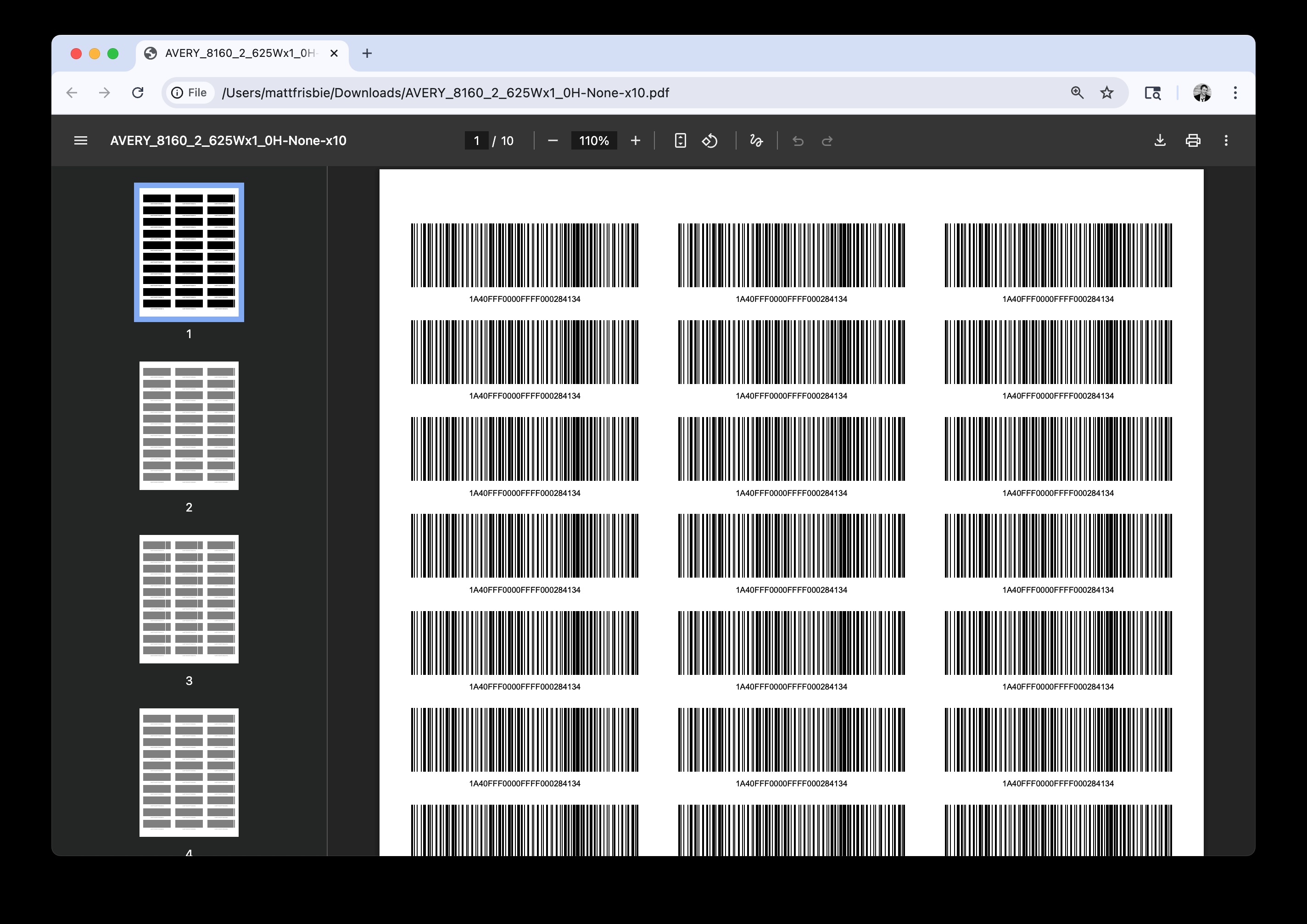 Barcode/text layout rendered on Avery 8160