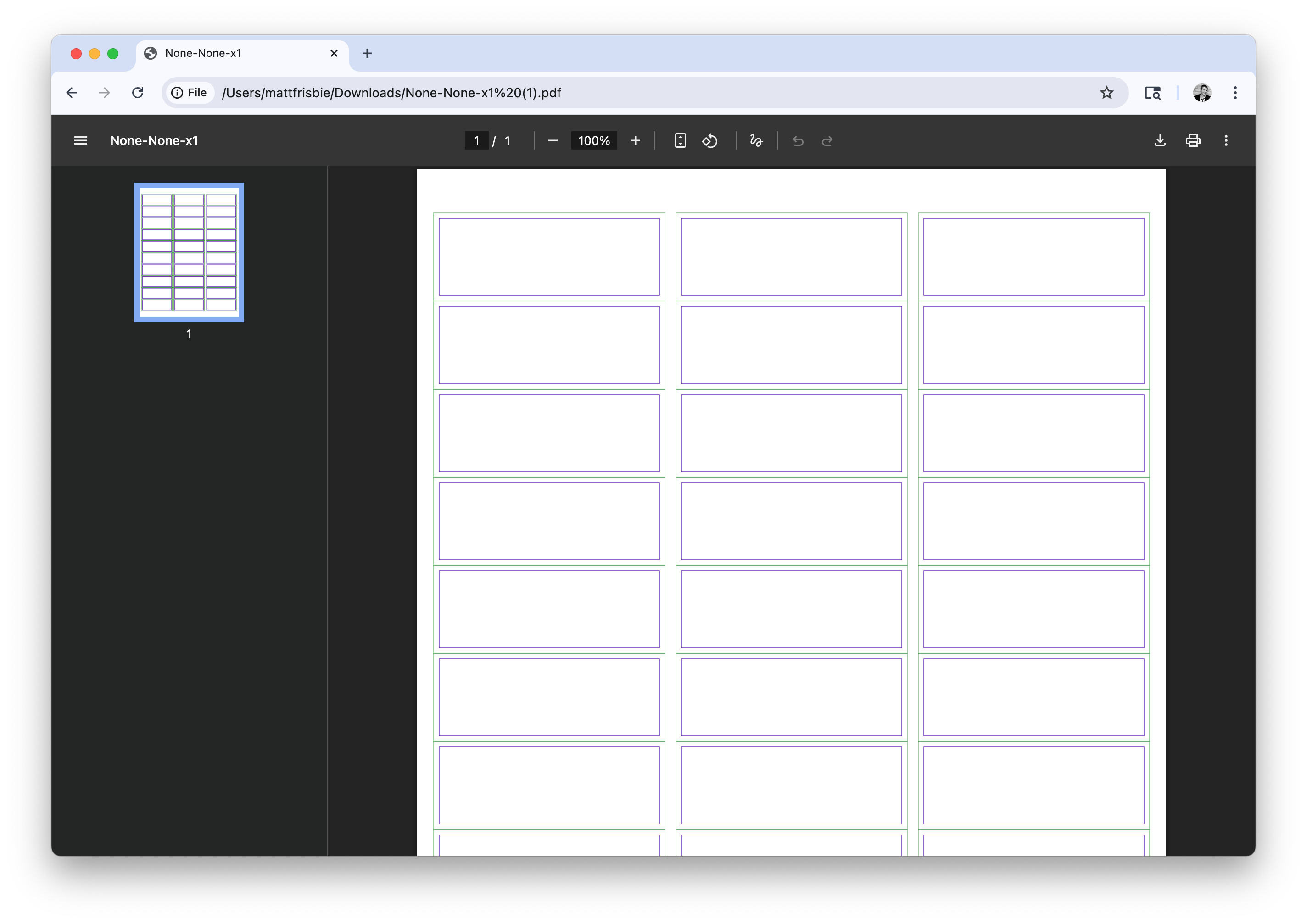 Here is an example template for an 8.5"x11" sheet of Avery 8160 labels (3 columns and 10 rows, 30 total), with 1/16" margins: