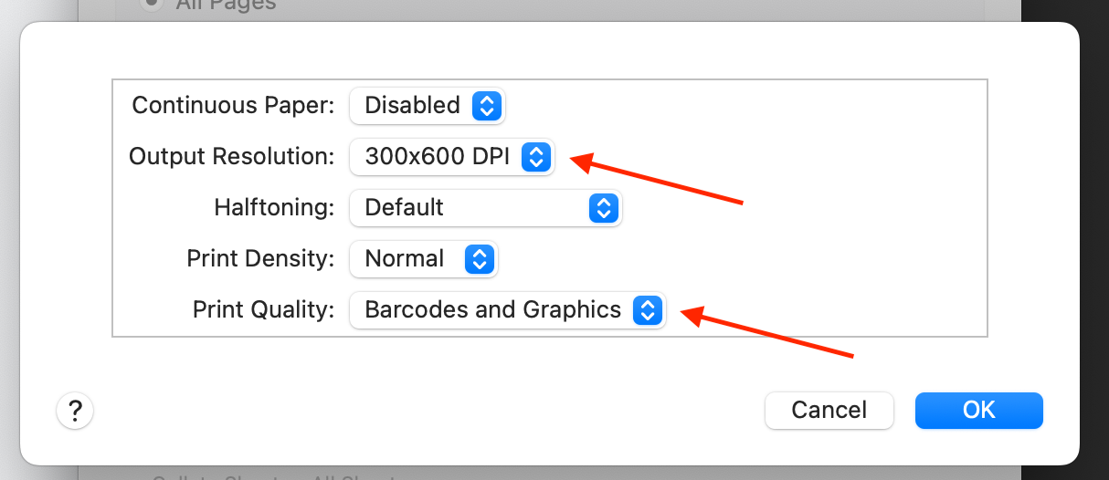 - Print Quality / DPI: For text and barcode clarity, use 300 DPI or higher when available. However, you may not always want to use the highest DPI available. See Troubleshooting for additional details.