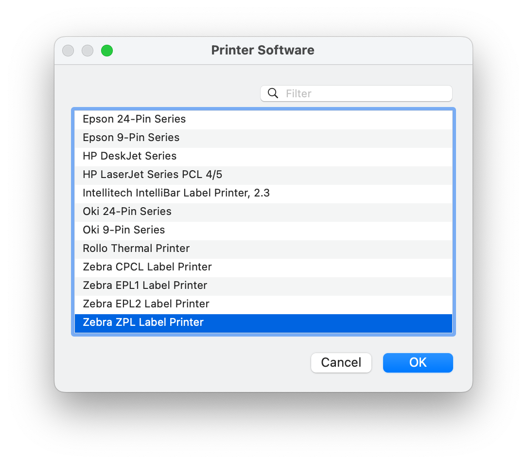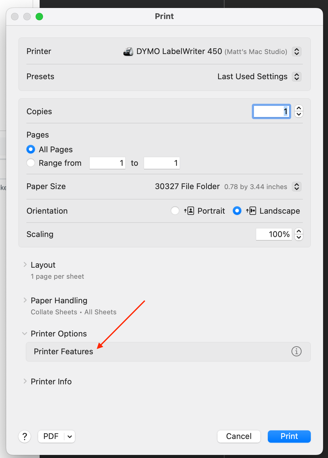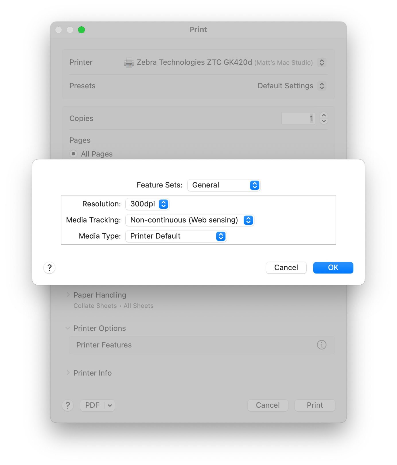 Some PDF viewers will have their own print dialogs, and others will use the system print dialog. Below are three different print dialogs printing the same labels: Adobe Acrobat, Google Chrome, and Mac OS X: