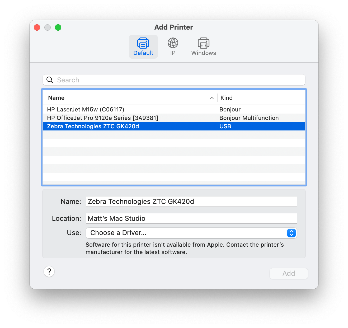 Note: When adding your printer, your operating system may offer a default driver for printing. It's strongly recommended that you install any available drivers from the manufacturer and use that instead.