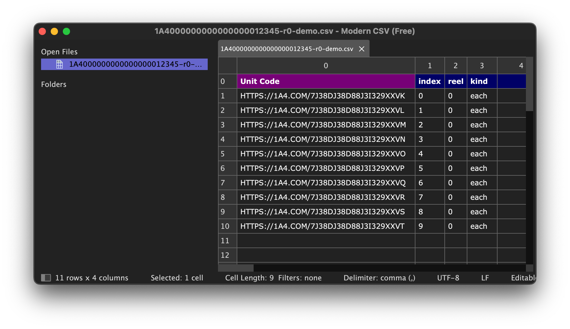 Example CSV with Unit Code column