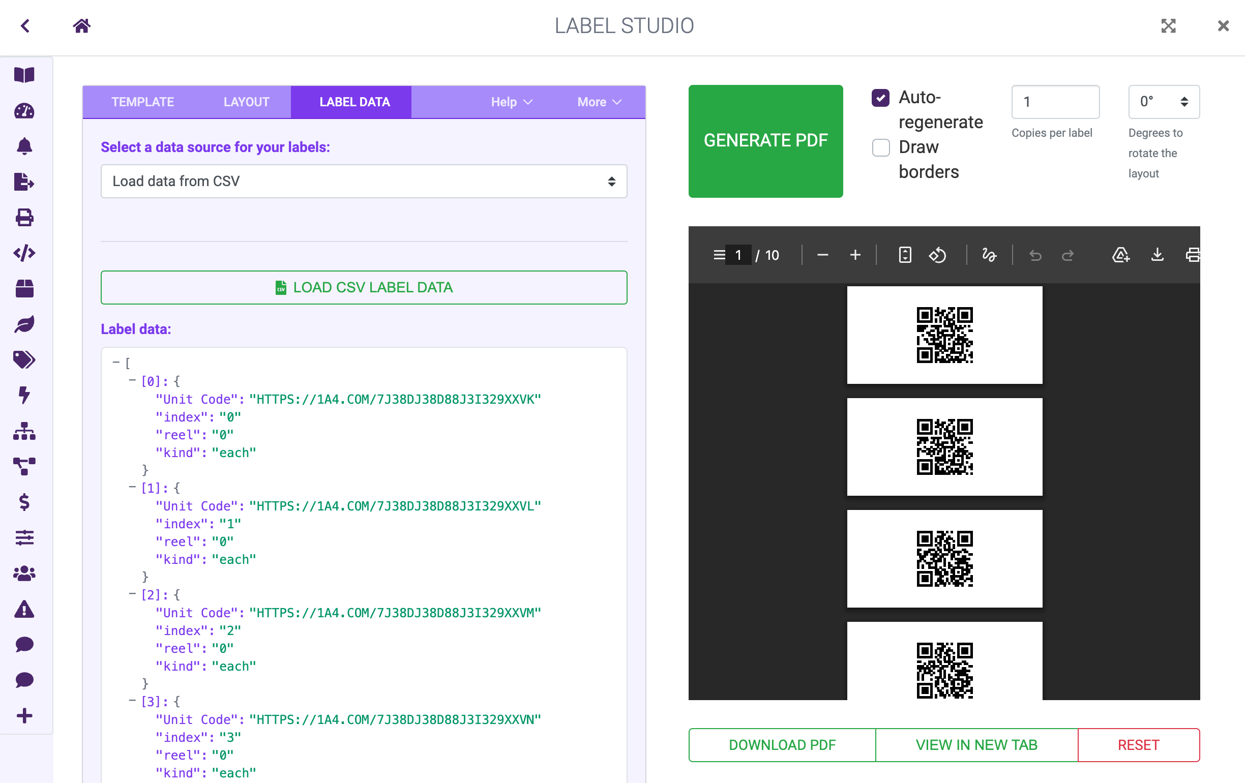 After loading your CSV, the labels will automatically generate. Each row in your CSV produces one QR code label.