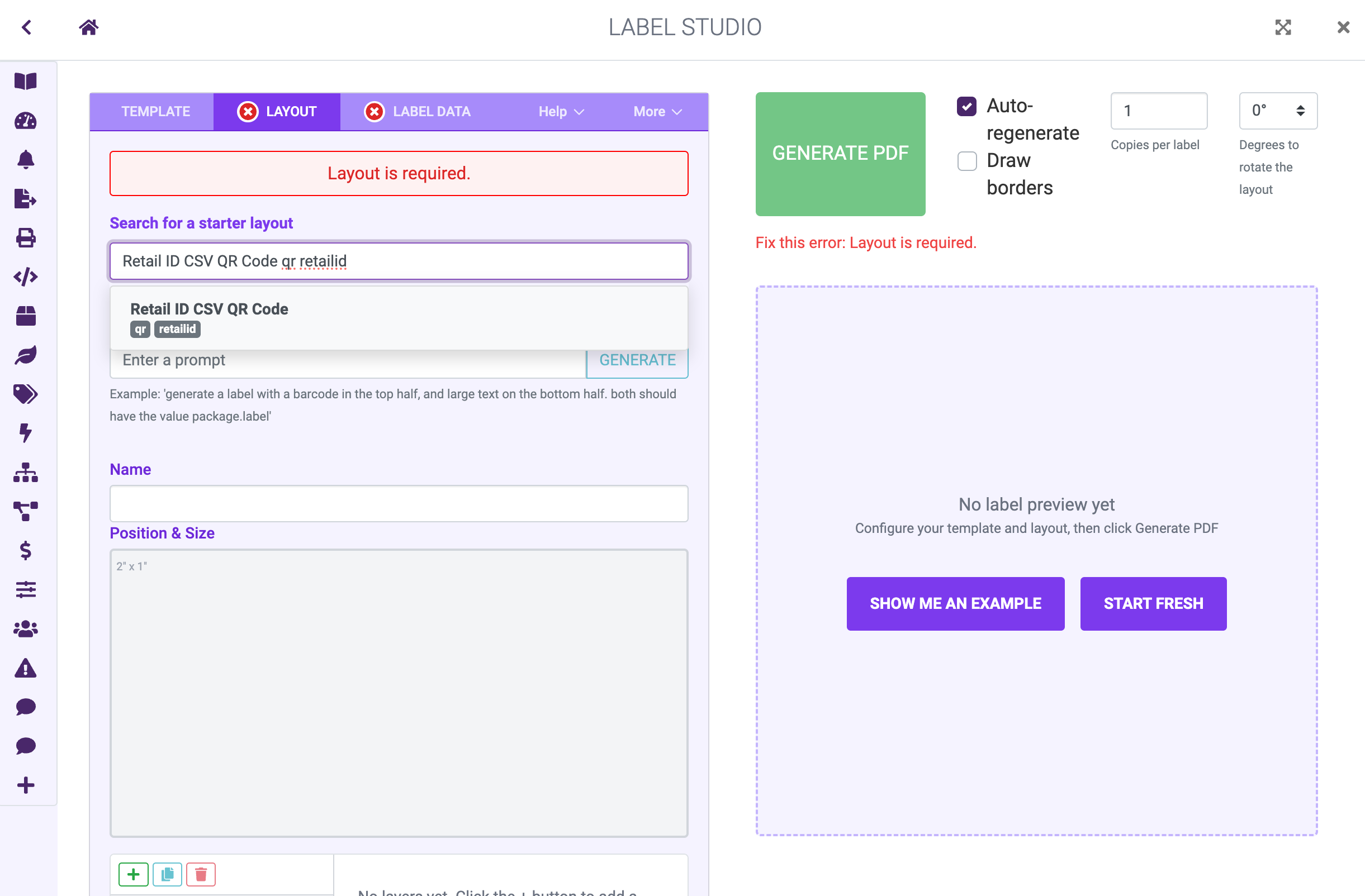 Click the LAYOUT tab. Search for Retail ID CSV QR Code in the starter layout dropdown and select it.