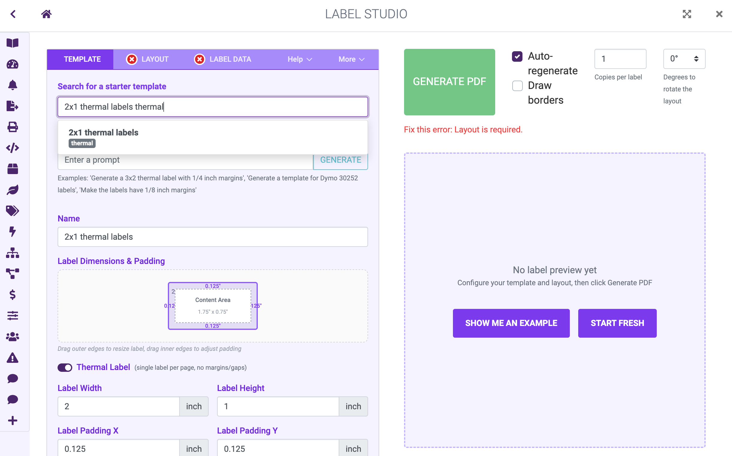 Selecting a 2x1 thermal label template